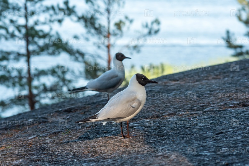 Черноголовая чайка на скалистом берегу озера