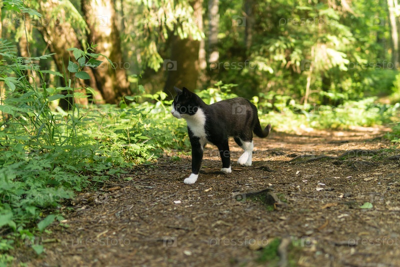 Кот идет по лесной тропинке