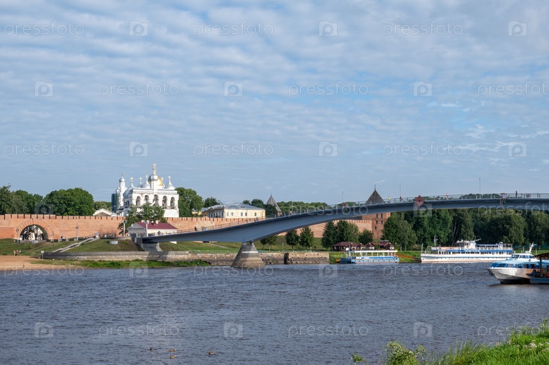Новгород, Новгородская область, Россия — 30 июля 2024 г. Вид на Новгородский кремль через реку Волхов