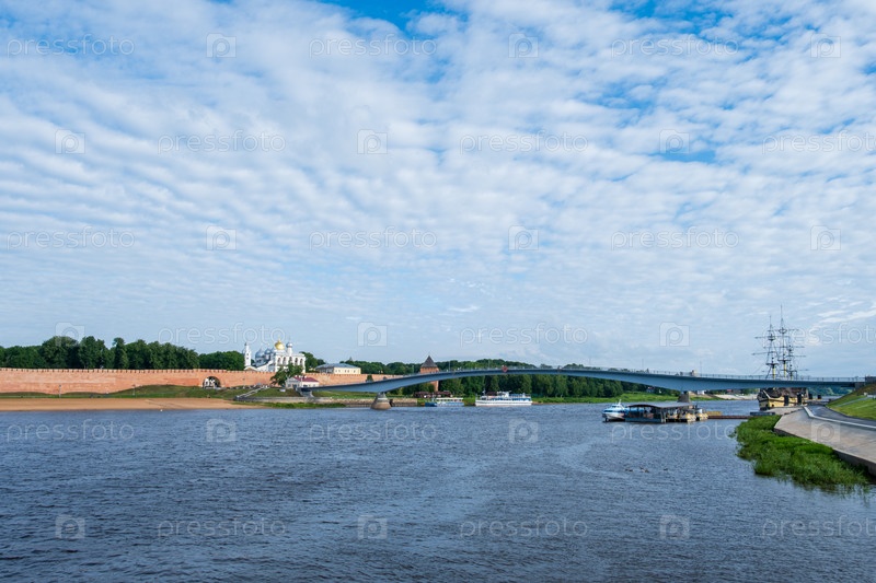 Великий Новгород, Новгородская область, Россия - 30 июля 2024 года. Вид на Новгородский кремль через реку Волхов