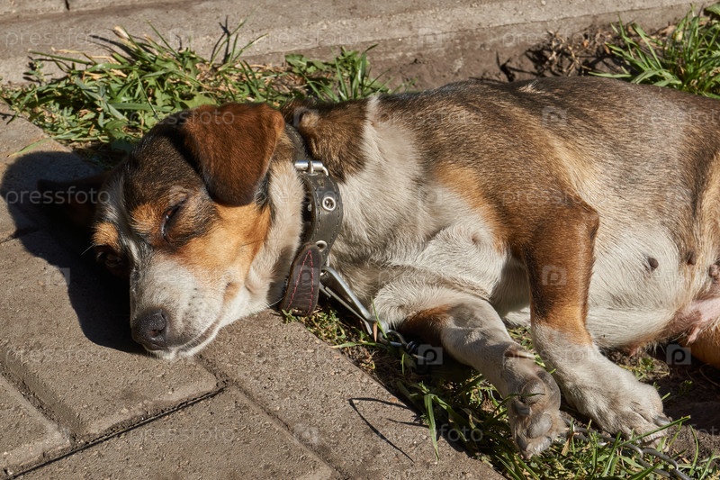 Собака лежит на лужайке во дворе дома и греется в лучах осеннего солнца