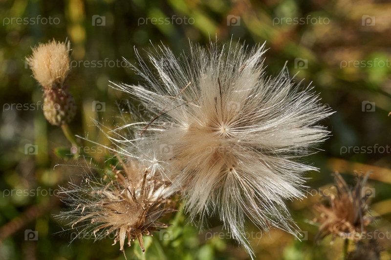 Крупный план пушистых соцветий полевого бодиака (Cirsium arvense) вид многолетних травянистых растений семейства астровых