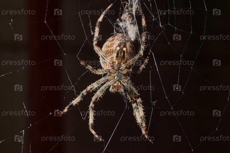 Аранеус сидит в центре паутины и ждет добычи, попавшей в сеть