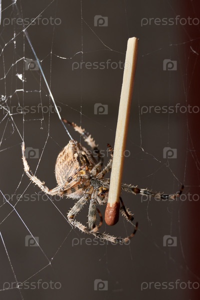 Аранеус сидит в центре паутины и ждет добычи, попавшей в сеть