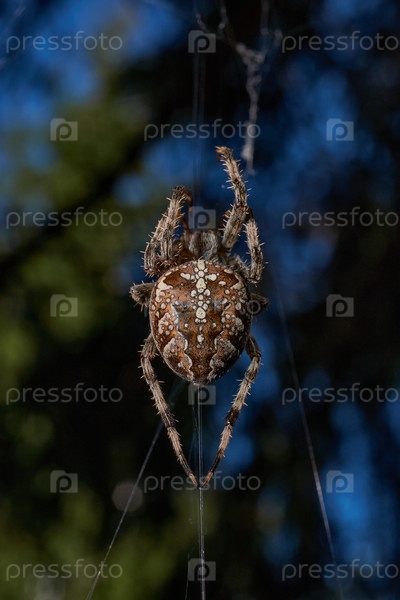 Аранеус сидит в центре паутины и ждет добычи, попавшей в сеть