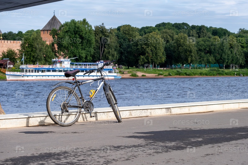 Новгород, Россия - 30 июля 2024 г. Велосипедные стойки на набережной с видом на реку Волхов