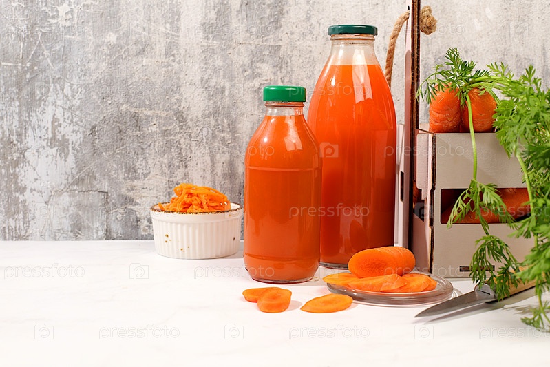 Свежий натуральный морковный сок или смузи, детокс-напиток в стеклянной бутылке и стакане, свежая морковь в коробке на кухонном фоне, способствует снижению веса, здоровому образу жизни и вегетарианской концепции питания,