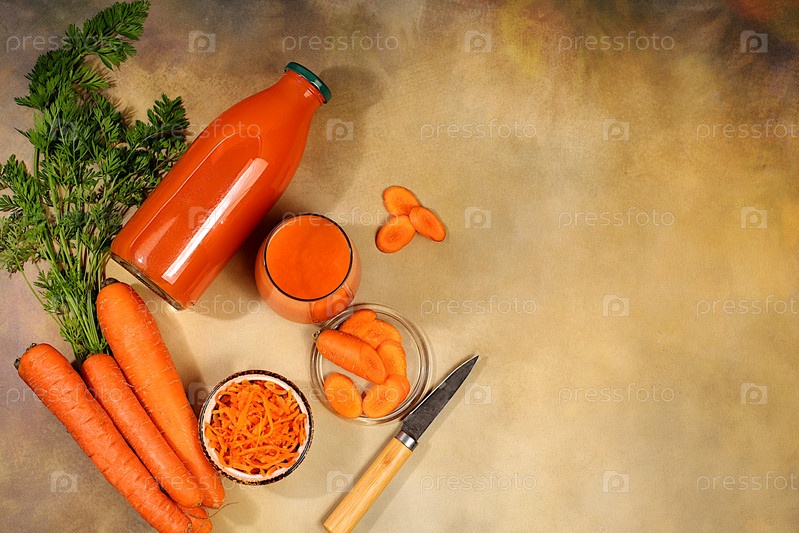 Свежий натуральный морковный сок или смузи, детокс-напиток в стеклянной бутылке и стакане, ломтики моркови на бетонном фоне, помогает похудеть, здоровый образ жизни и вегетарианская диета концепция, вид сверху,