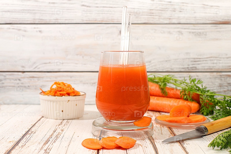 Свежий натуральный морковный сок или смузи, детокс-напиток в стеклянной бутылке и стакане, ломтики моркови на деревянном фоне, способствует снижению веса, здоровому образу жизни и вегетарианской концепции питания