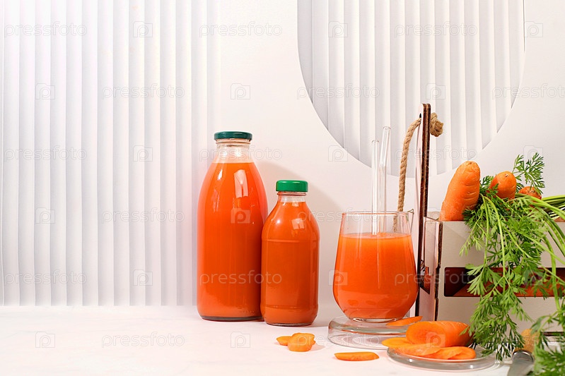 Свежий натуральный морковный сок или смузи, детокс-напиток в стеклянной бутылке и стакане, свежая морковь в коробке на кухонном фоне, способствует снижению веса, здоровый образ жизни и концепция вегетарианского питания, выборочный фокус