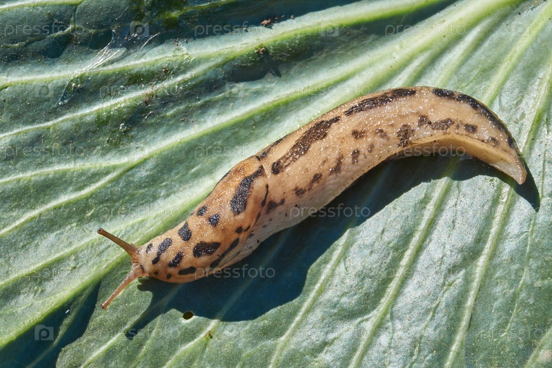 Большой слизь (Limax maximus) ползёт по листьям капусты.Большой слизь или большой леопардовый слизь наземный брюхоногий моллюск отряда лёгочных улиток семейства Limacidae