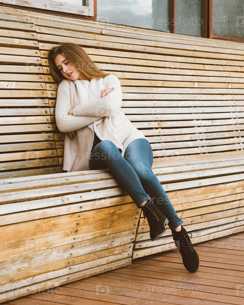 Красивая молодая девушка с длинными каштановыми волосами сидит на деревянной скамейке из досок и отдыхает, спит или дремлет на свежем воздухе. Фотосессия на открытом воздухе с привлекательной женщиной зимой или осенью
