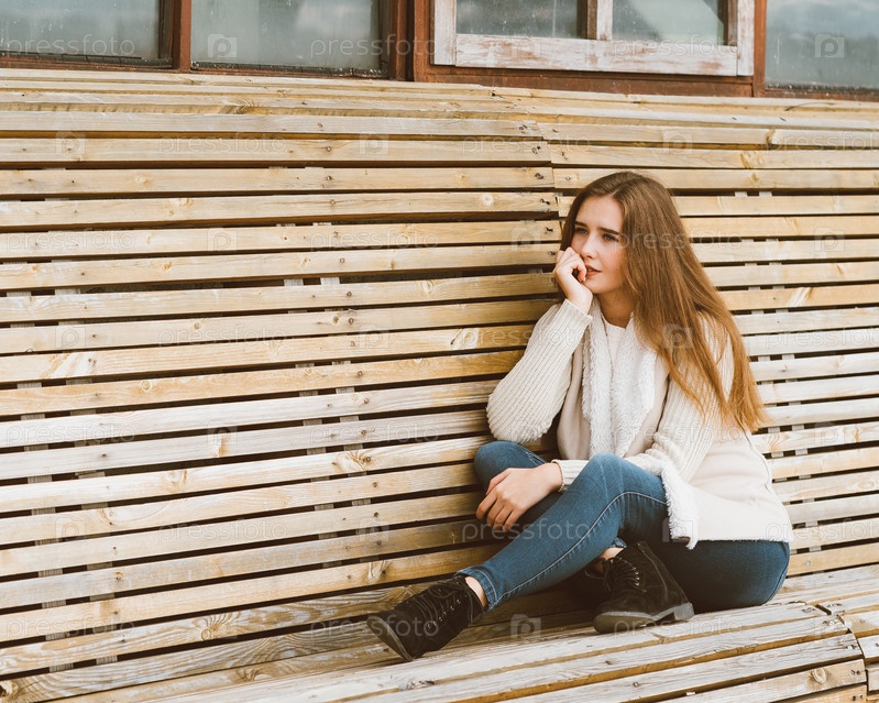 Красивая молодая девушка с длинными каштановыми волосами сидит на деревянной скамейке из досок и отдыхает, расслабляется и размышляет. Фотосессия на открытом воздухе с привлекательной женщиной зимой или осенью