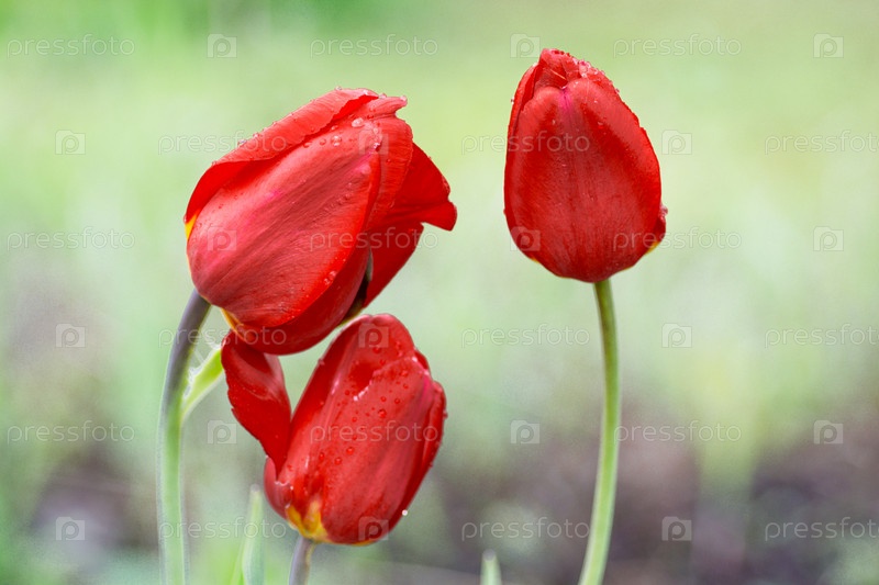 Три красных тюльпана на зеленом размытом фоне