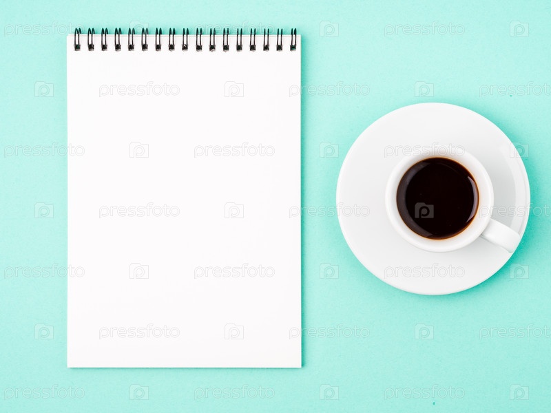 Блокнот открыт с белой пустой страницей для записи идеи или списка дел, чашка кофе на ярко-синем фоне