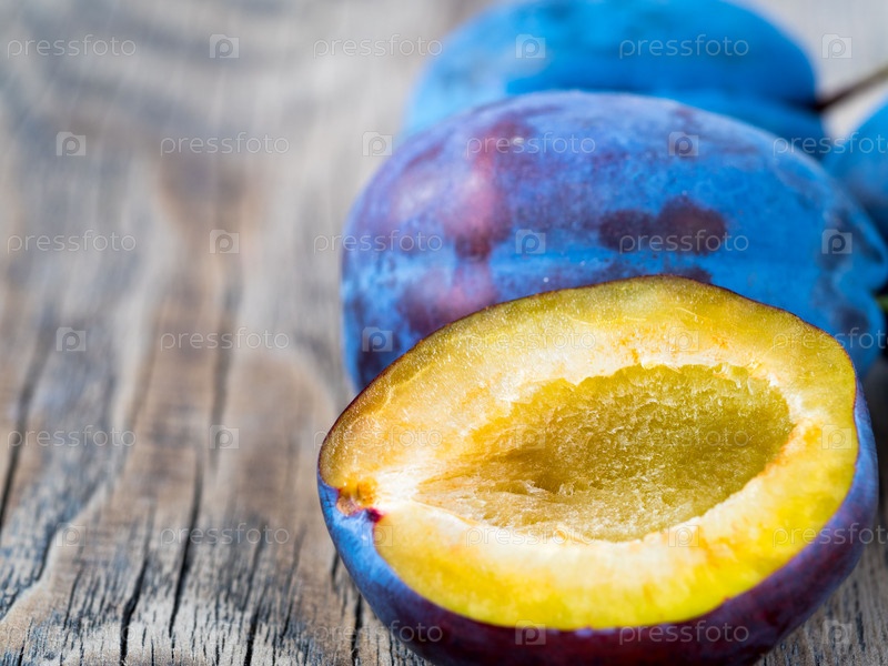 Большая синяя сладкая слива и разрезанная пополам