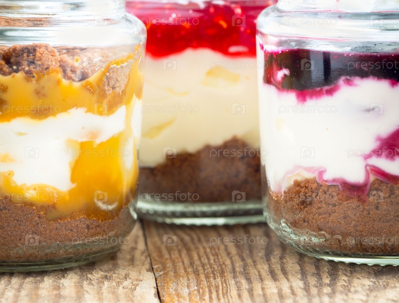 Сладкий десерт чизкейк в банке печенье, сырный крем, карамель, ягоды