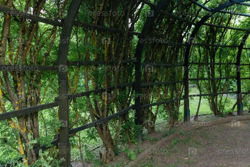 Вид изнутри тенистой перголы в парке