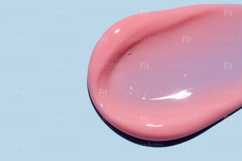 Розовый блеск для губ мазок мазок на синем фоне. Презентация текстуры продукта для макияжа