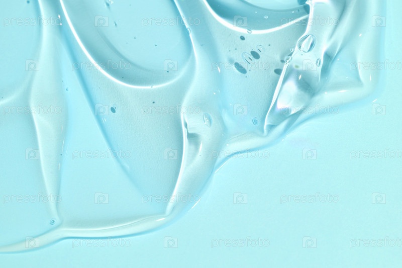 Гиалуроновая кислота сыворотка и текстура желе. Красота уход за кожей жидкий гель фон. Прозрачный косметический крем с пузырьками крупным планом на синем