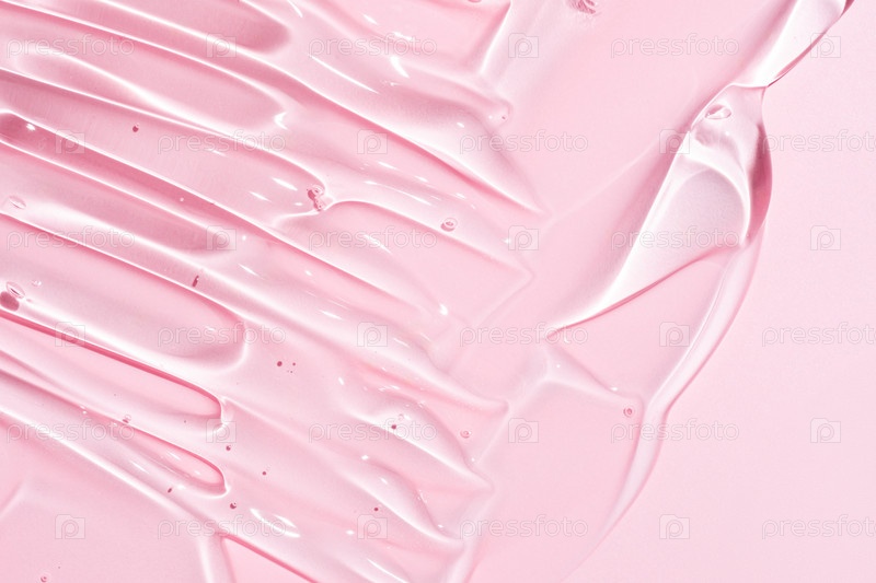 Крупным планом гелевая текстура косметических средств. Прозрачный крем на розовом фоне с пузырьками. Макрофотография. Размытие и селективный фокус