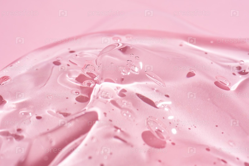 Образец косметического геля на светло-розовой поверхности. Абстрактная текстура геля на розовом фоне