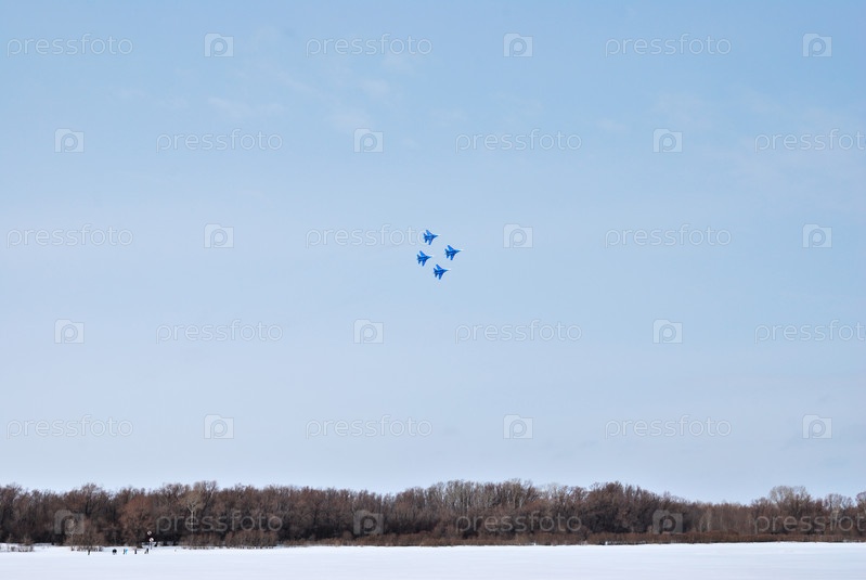 Выступление пилотажной группы «Русские Витязи» на авиашоуОмск, Россия - 19 марта 2016 г.: Выступление пилотажной группы «Русские Витязи» на авиашоу