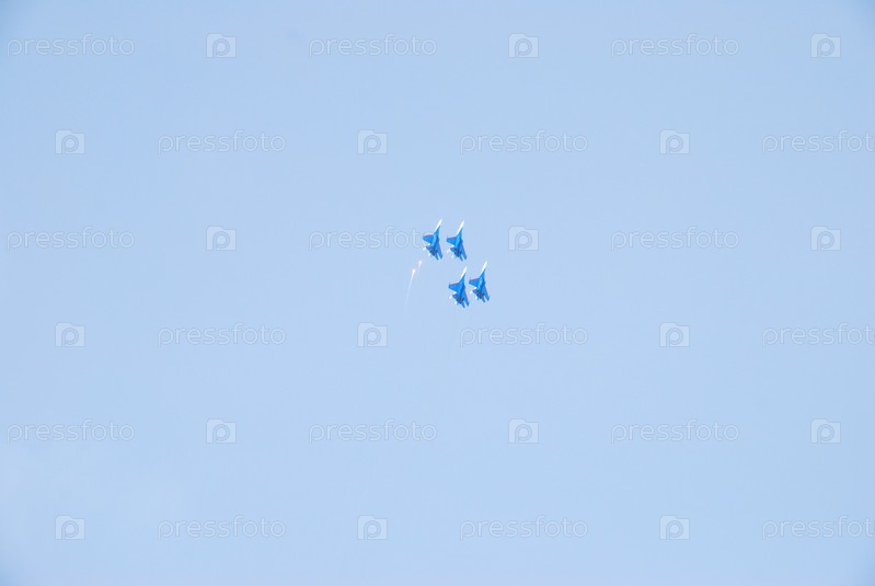 Выступление пилотажной группы «Русские Витязи» на авиашоуОмск, Россия - 19 марта 2016 г.: Выступление пилотажной группы «Русские Витязи» на авиашоу