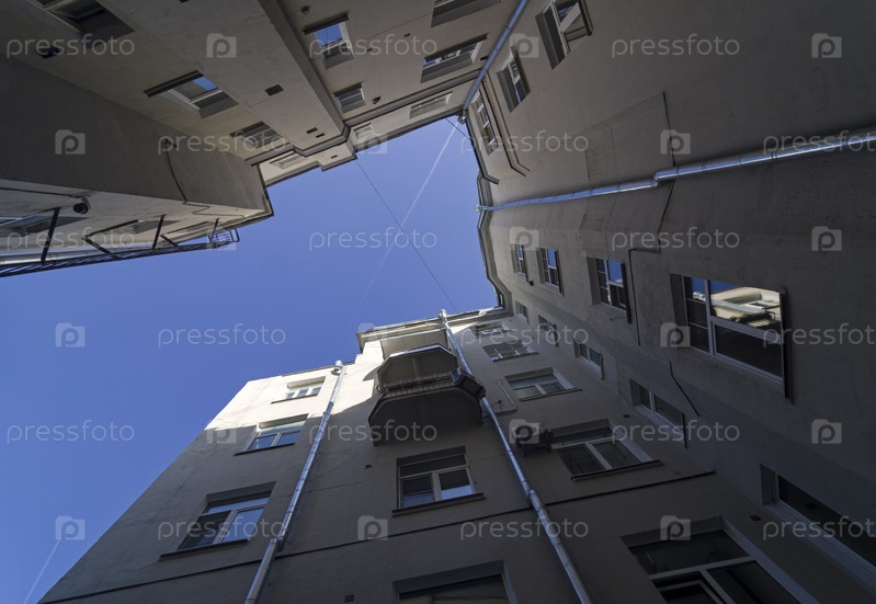Двор-колодец. Старый жилой дом в центре Москвы, Скатерный переулок, 22. Солнечный день в сентябре