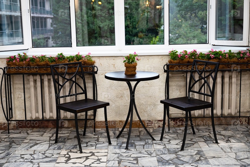 Уютный балкон со столом и стульями возле окна с цветами в горшках