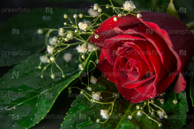 Один бутон бордовой или черной розы лежит на большом зеленом листе