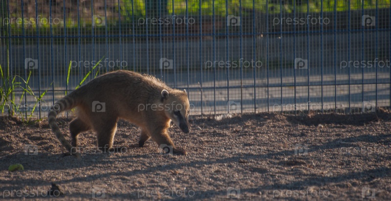 Коати гуляет по своему вольеру