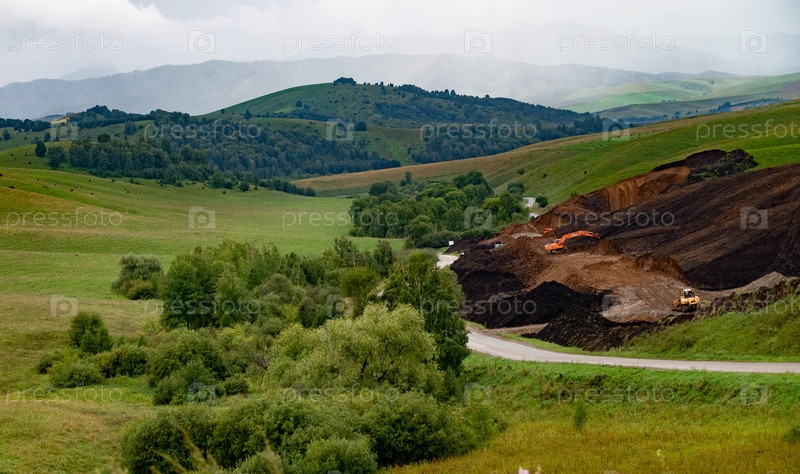Оранжевый экскаватор копает землю в пасмурный день, снято на открытом воздухе. Тяжелая техника на строительной площадке, демонстрирующая земляные работы