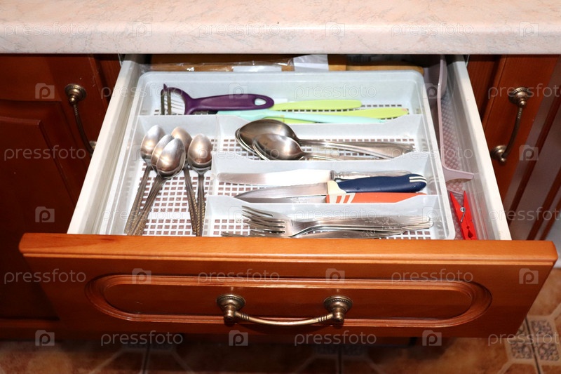 Выдвинутый деревянный ящик со столовыми приборами на кухне