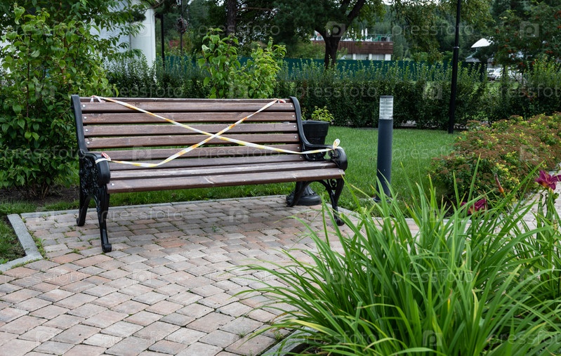 Парковая скамейка с предупреждающей лентой в саду