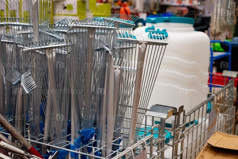 Металлические грабли и большие пластиковые контейнеры, выставленные в хозяйственном магазине. Инструменты и средства для хранения для садоводства и обустройства дома