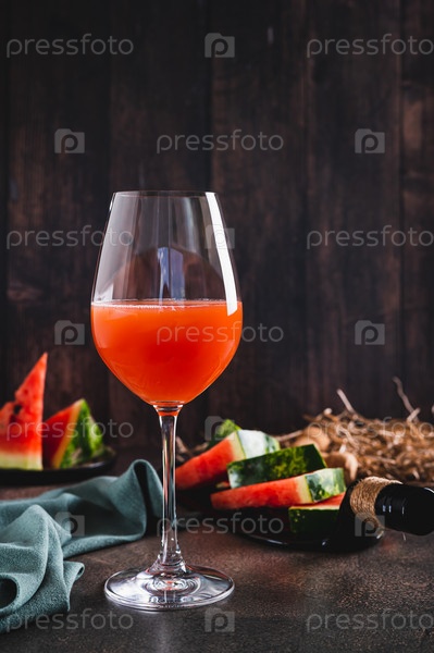Вкусное арбузное вино в бокале и кусочки арбуза на тарелке вертикальный вид