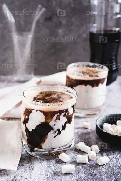 Напиток фьюжн из колы и зефира в стаканах на столе вертикальный вид