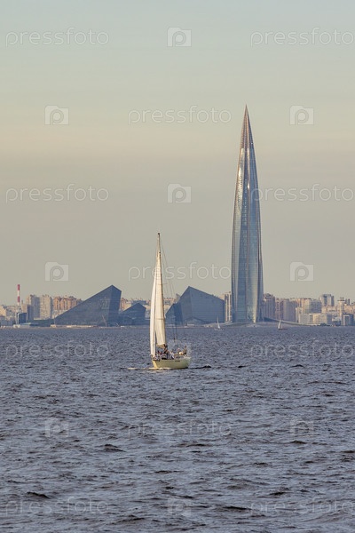 Россия. Санкт-Петербург. Навигация в Финском заливе. Парусные яхты на фоне общественно-делового комплекса Лахта-центр. Россия. Санкт-Петербург. Навигация в Финском заливе. Плавучие яхты на фоне Lakhta Center для публики и бизнеса