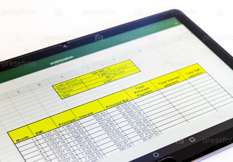 Снимок листа Excel на экране планшета, показывающий таблицу погашения банковского кредита