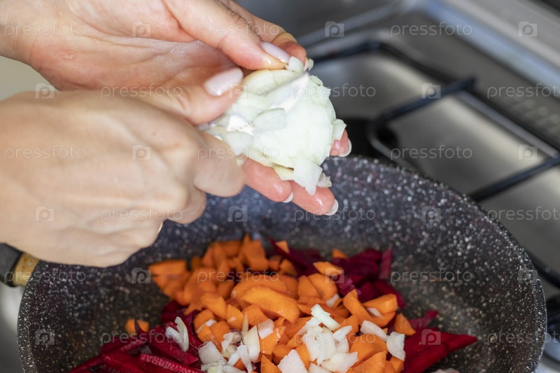 Кадр свежей нарезанной свеклы, лука и моркови, тушеных на сковороде. Еда