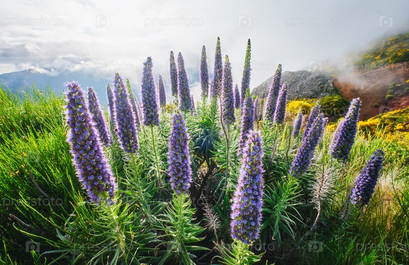Ландшафт Мадейры с цветами Pride of Madeira и цветущими кустарниками Cytisus, Португалия