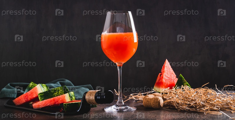 Вкусное арбузное вино в бокале и кусочки арбуза на тарелке веб-баннер