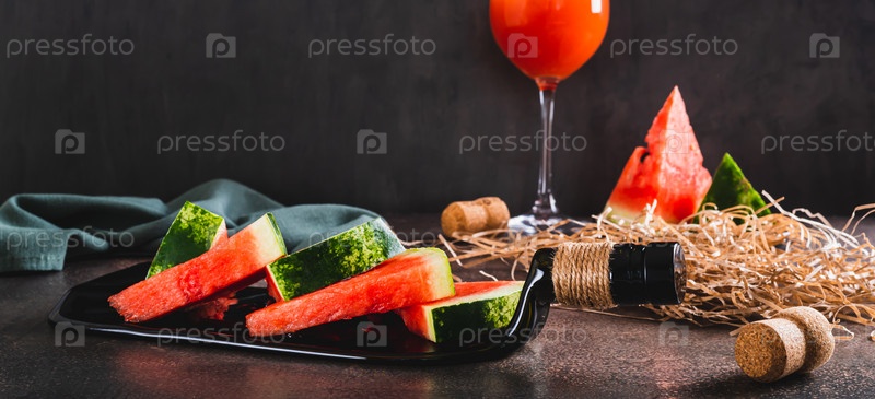Кусочки арбуза на тарелке в форме бутылки вина на столе и бокал вина