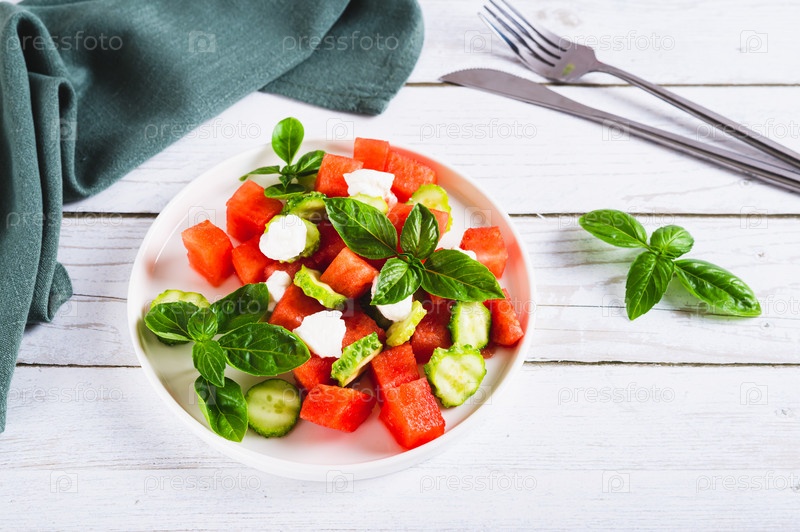 Диетическая смесь из арбуза, огурца, рикотты и базилика на тарелке на столе