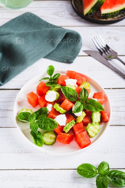 Диетическая смесь из арбуза, огурца, рикотты и базилика на тарелке на столе вертикальный вид