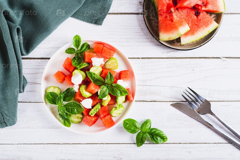 Вкусный салат из арбуза, огурца и рикотты на тарелке на столешнице