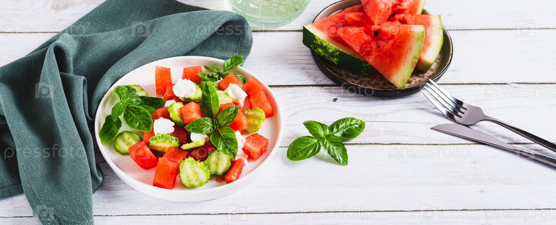 Вкусный салат из арбуза, огурца и рикотты на тарелке на столе веб-баннер