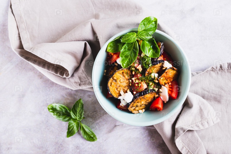 Крупный план салата из жареных баклажанов, помидоров и рикотты в миске на столешнице