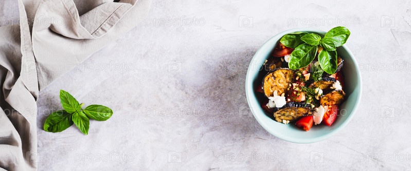 Вегетарианский салат из баклажанов с помидорами и сыром в миске вид сверху веб-баннер